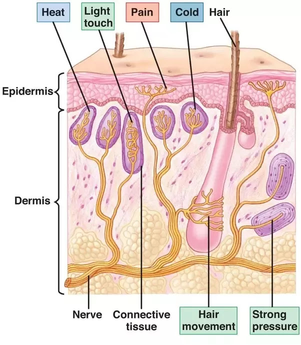 • Sensibilidad (p. ej. al dolor) por medio de los nervios superficiales y sus terminaciones nerviosas.